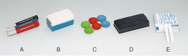 D935(A ~ E)/(A)マーカー(3本) (B)イレーサー (C)マグネット(10コ) (D)黒板消し (E)チョーク(6本)