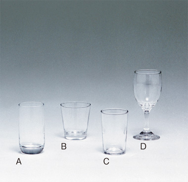 | 品名 | (A)タンブラー 8オンス (B)ロックグラス (C)タンブラー 7オンス (D)ワイングラス |